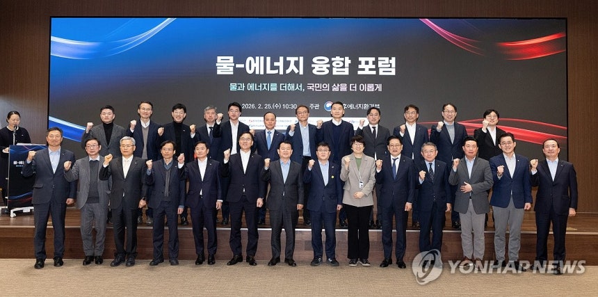 김성환 기후에너지환경부 장관(앞줄 왼쪽 여덟번째)이 25일 서울 중구 한국수력원자력 방사선보건원에서 열린 물-에너지 융합 포럼 출범식에 참석, 참여기관 대표들과 기념 촬영하고 있다.